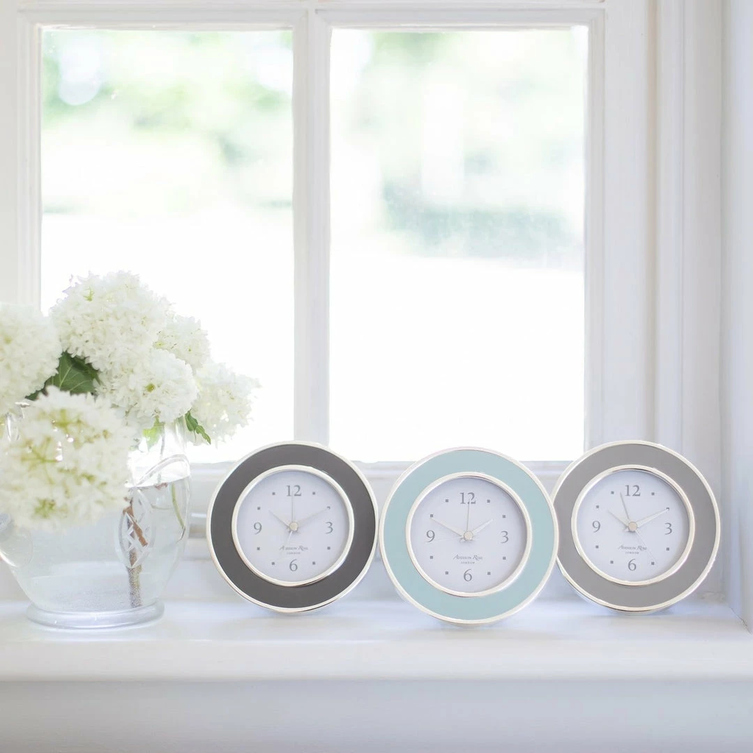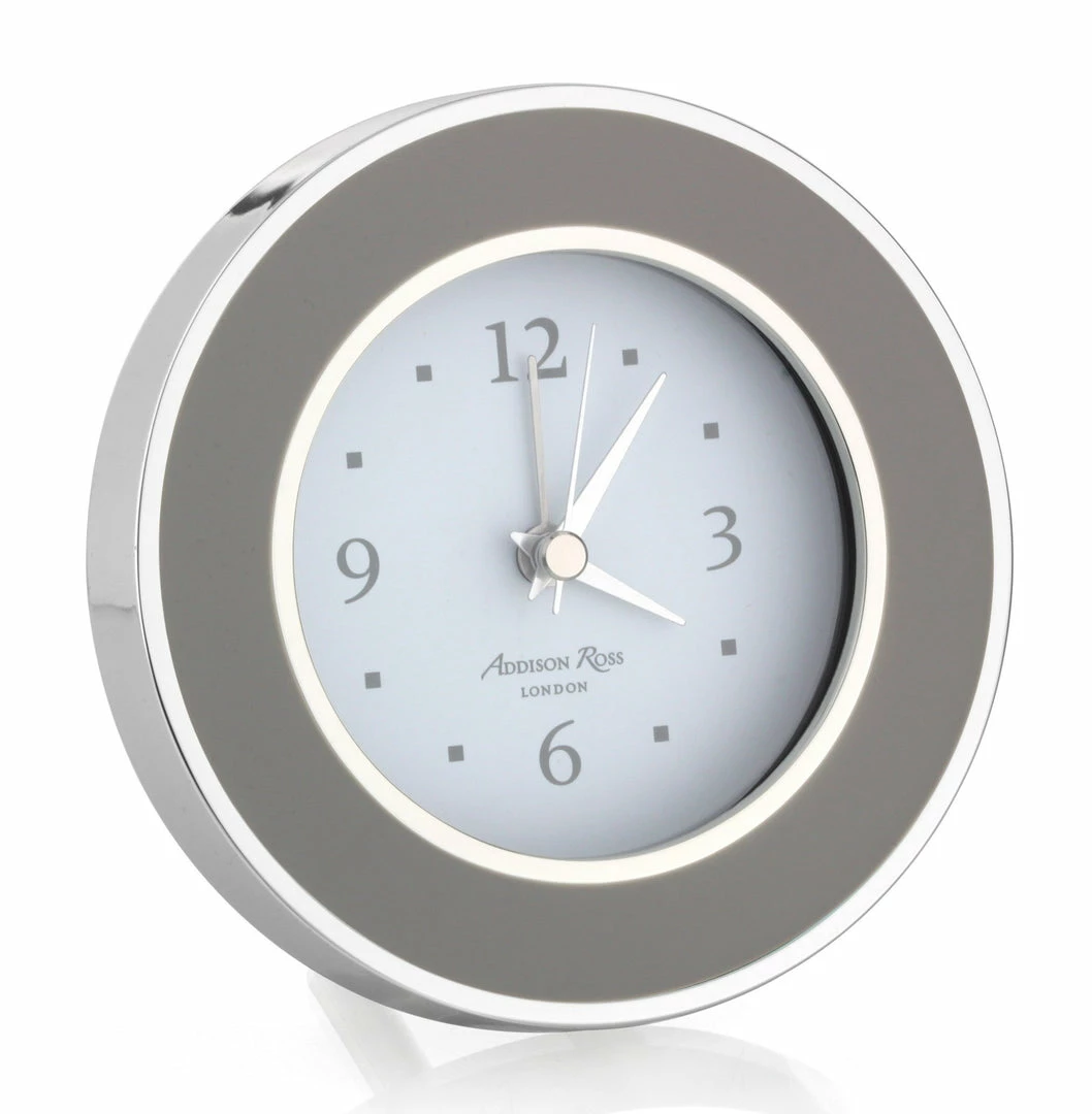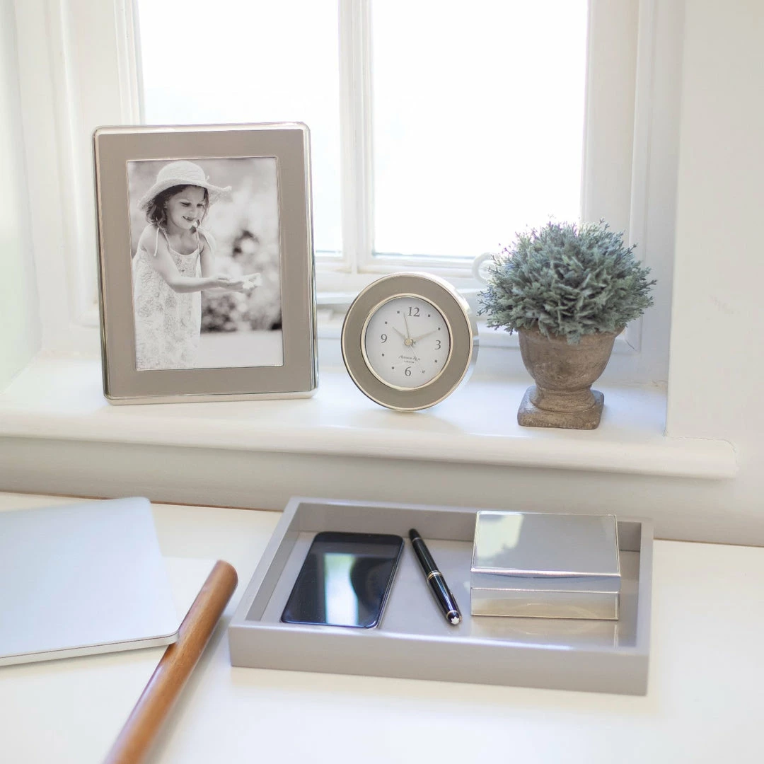 Our taupe enamel alarm clock beautifully compliments our enamel frames, complete with an alarm function, this clock is ideal for a bedside table or desk.