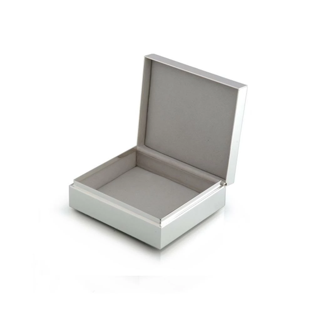 Beautifully finished, our polished faux grey horn box is finished in silver plate. This versatile hinged trinket box is lined with rich black velvet both inside and beneath the base. A perfect size for jewelry, cuff links or desk top bits and pieces.Â