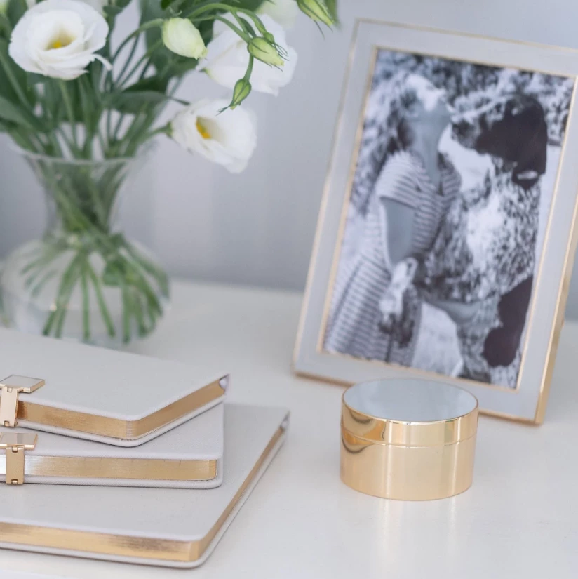 This incredibly pretty little 3″ chiffon grey enamel trinket pot is lined in soft stone coloured velvet. Finished with gold plate, with a fully removable lid, it is suitable to store jewellery, bedside or desk top bits and pieces.
