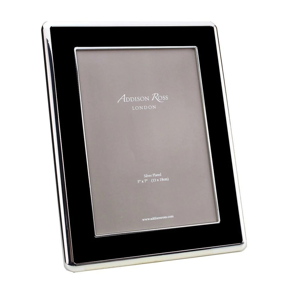 This exclusive and elegant approximately 1″ wide enamel frame in black enamel features a soft curved silver edge with a dove grey velvet back stand that has elegant round silver turn buttons. This frame suits all interiors, simple and elegant a perfect gift for any occasion.