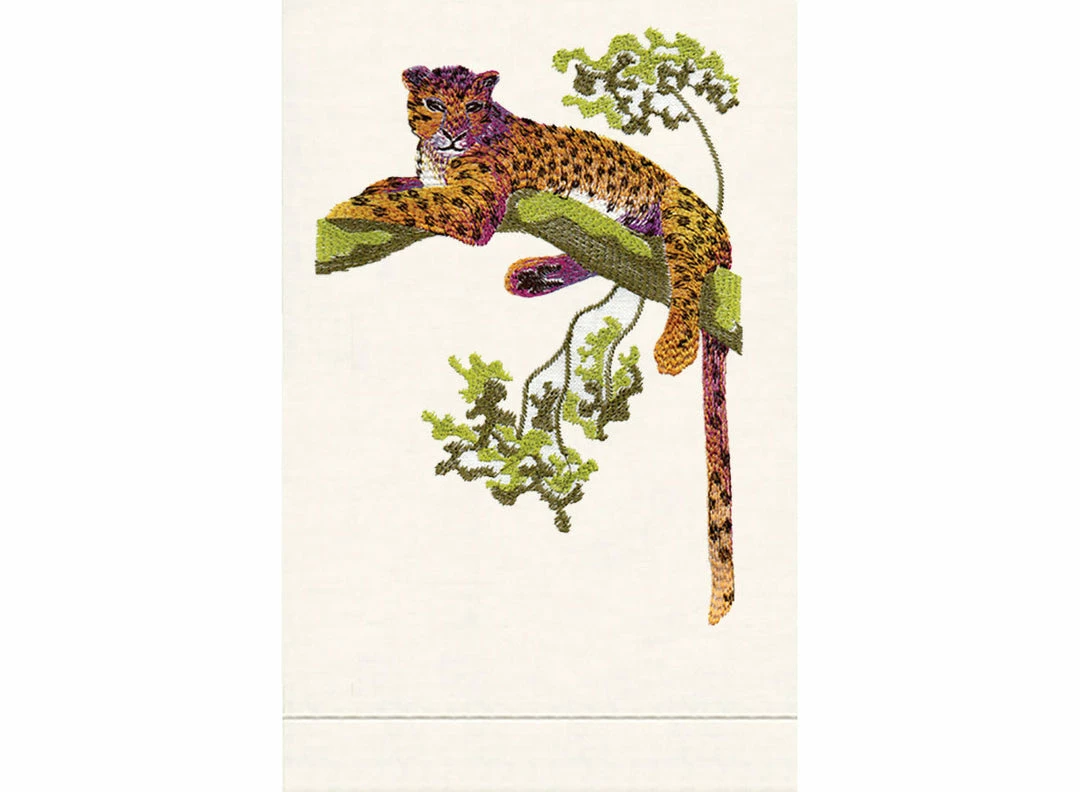 A super way to welcome your guests and dress up a powder room. The beautiful Jaguar is machine embroidered on 100% linen guest towels.