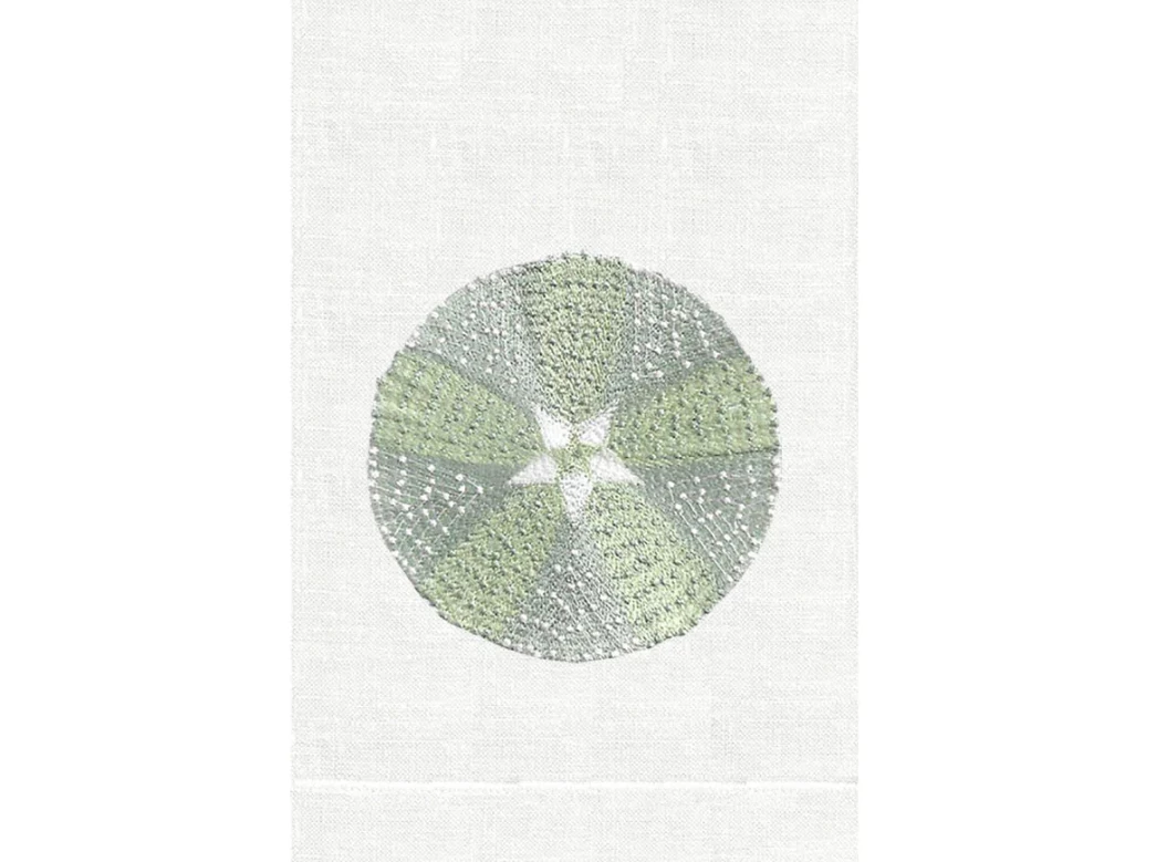 Round Urchin is machine embroidered on 100% linen guest towel.
