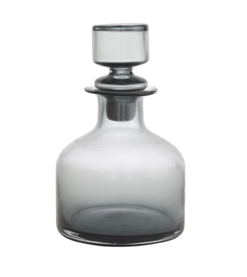 This striking smoke glass decanter with stopper will add chic to your table. Use on your bar in combination with your own vintage decanters or put one in each bathroom to hold mouthwash. A great gift when filled with a homemade infused liquor.