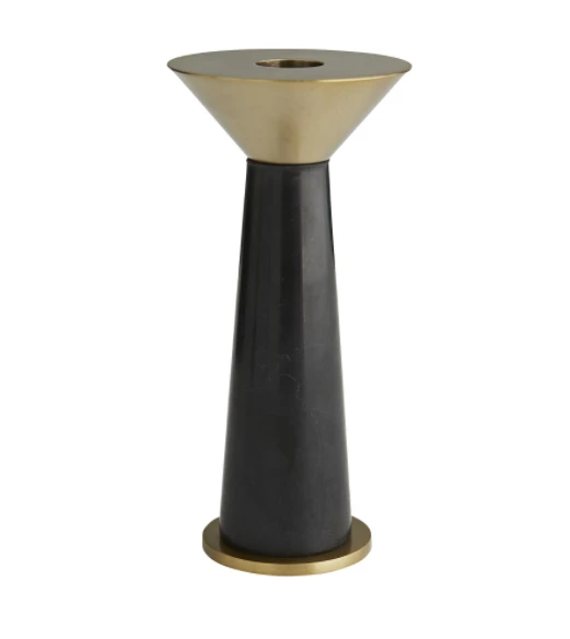 Create a tranquil setting while delivering a luxe touch to a room with these delicate candleholders. Each features a conical-shaped antique brass that funnels into a white marble base fitted with an antoque brass foot. The glow of a taper candle’s flame creates ambiance and simultaneously accentuates the fluidity of the veining on the white marble base. The varied heights work to add depth and dimension to a console top or an etagere shelf. Marble may vary.