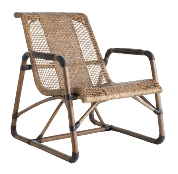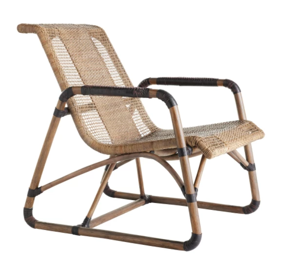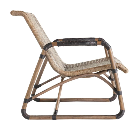 The Jax Chair delivers a handsome sinuous frame in organic materials. The flowing lounge chair silhouette features a tobacco toned woven rattan seat contrasted with rich espresso leather cuffed details, and a high back for maximum support and comfort. Rattan will vary.