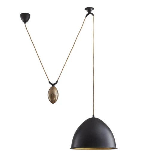 This adjustable Pendant Lamp is artfully weighted with a solid egg that allows you to hang the metal hooded light at any height. Finished in antiqued brass tones and dull bronzes, the Egg Drop Pendant Lamp also works high or low in terms of formality. It perfectly suits both over a counter or in pairs over a long table, as a task light over a desk or work table. A great versatile lamp!
