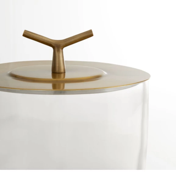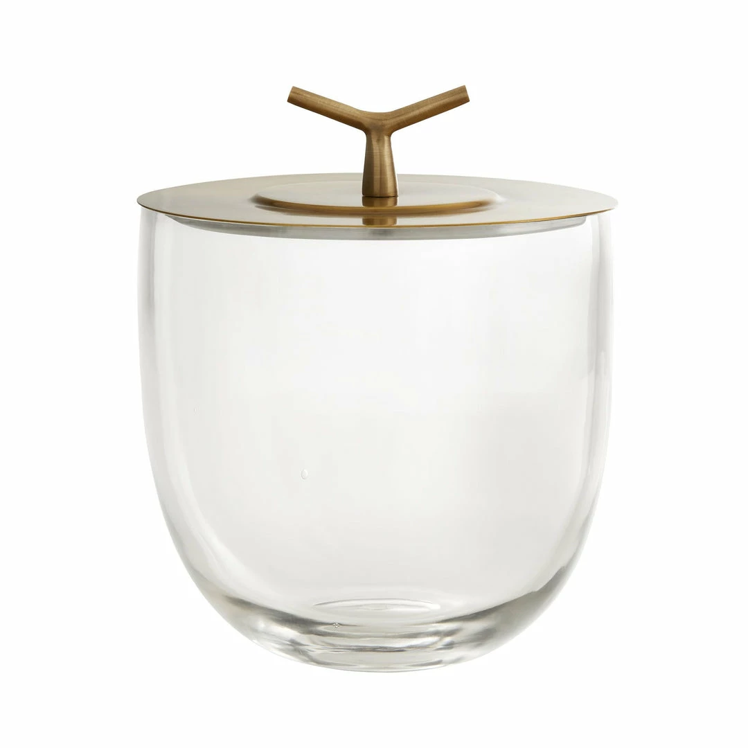 Elevate the bar cart with this sophisticated Ice Bucket. Made from clear glass with a thick base, it features a vintage brass lid with a unique wishbone-shaped handle for easy lifting. When not in use, it could be filled with decorative accents or double as a storage piece. Water tight.