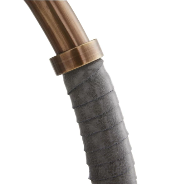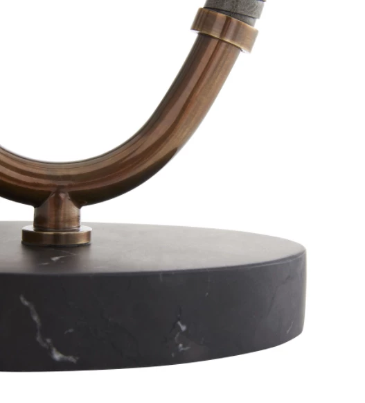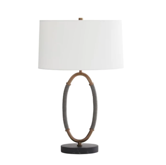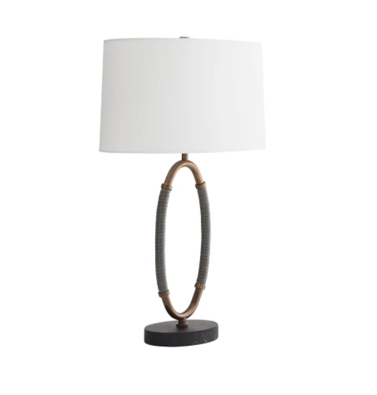 The Landon is a union of mastered craftsmanship and tactile materials. Each side of the oval-shaped heritage brass steel frame is wrapped in gray leather that seamlessly blends into a black marble base. Topped with an off-white microfiber shade with off-white cotton lining and a heritage brass sphere finial. Complete with a black cloth cord. Marble will vary.