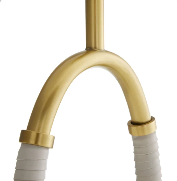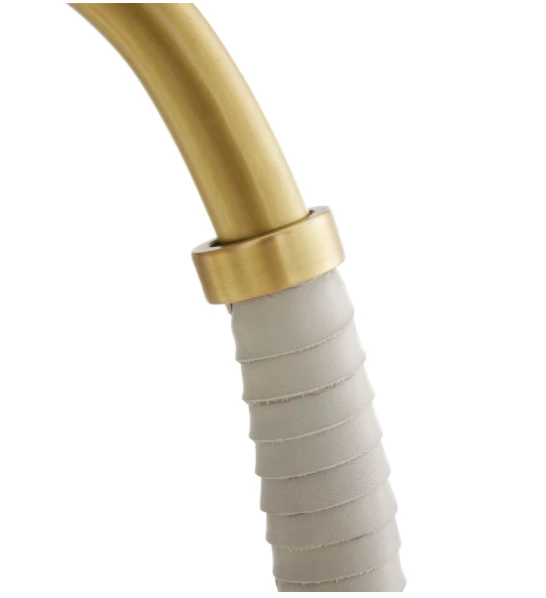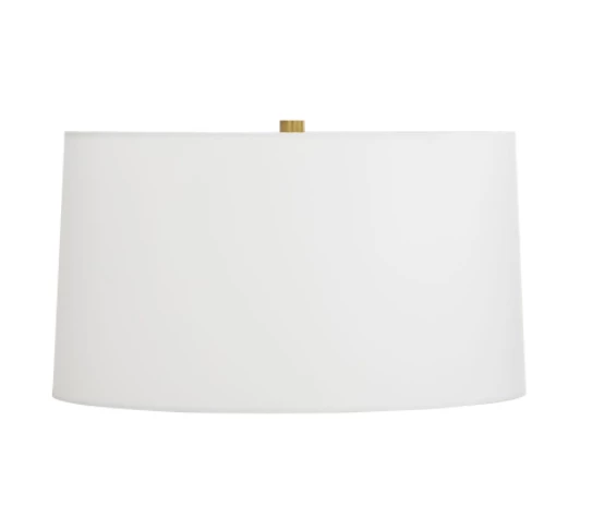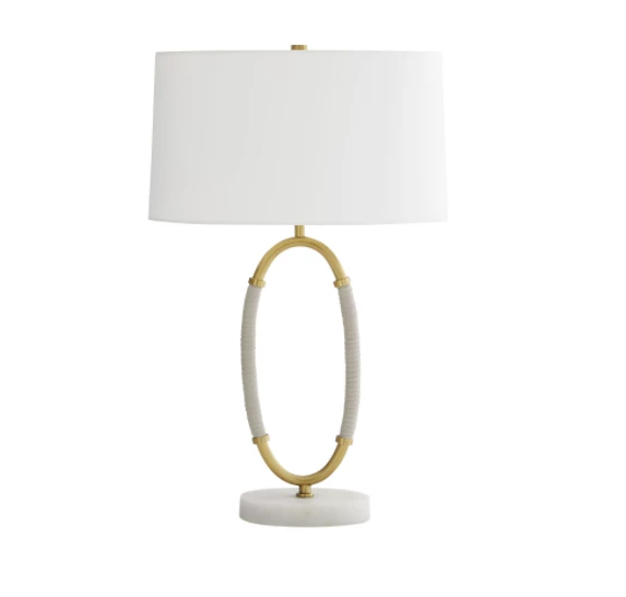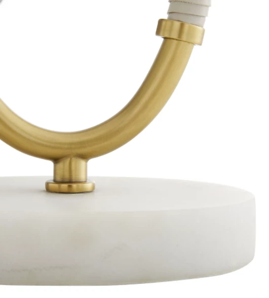 The Landon is a union of mastered craftsmanship and tactile materials. Each side of the oval-shaped antique brass steel frame is wrapped in cream-colored leather that seamlessly blends into a white marble base. Topped with an off-white microfiber shade with off-white cotton lining and an antique brass sphere finial. Complete with a taupe cloth cord. Marble will vary.