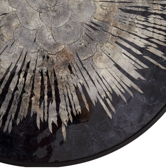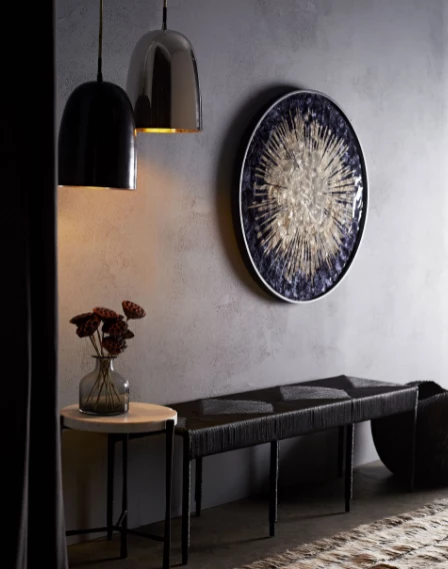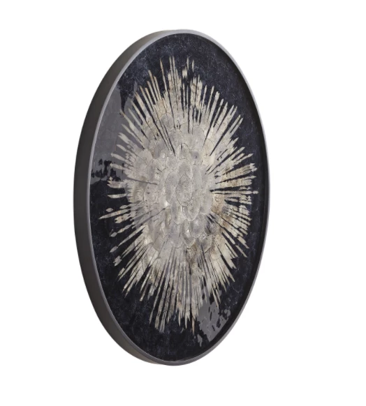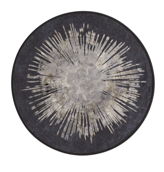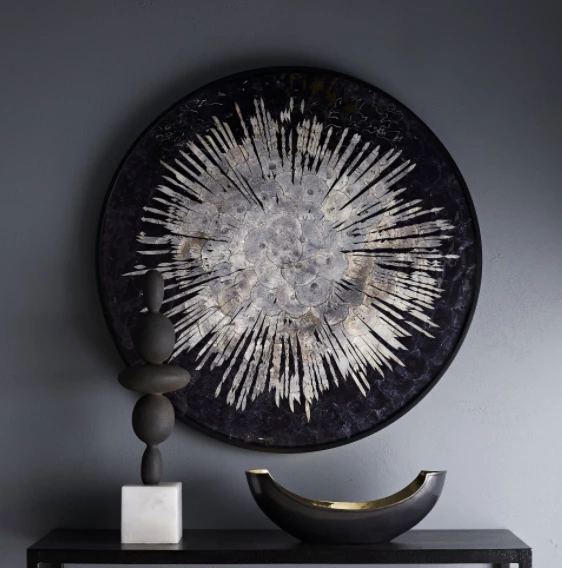 We looked to the deep depths of the sea for inspiration when creating this dynamic wall plaque. A hand-painted capiz shell in a radial pattern is vibrantly framed by black—almost indigo—wood bringing forth the translucency and iridescence of the material. Consider styling in multiples to deliver a more lively and textural look. Features a security cleat attachment. Finish will vary.