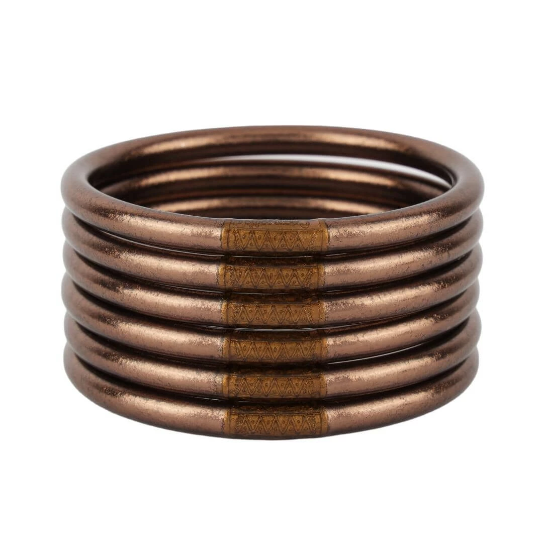 Handcrafted in Thailand by really nice people. Each Meteorite All Weather Bangle is made by a team of 20+ artisans, each bangle is hand made, each is a labor of love. Meteorite All Weather Bangles are made with organic products, at times a slight color differentiation might occur, this is only natural as humidity and temperature conditions do affect the outcome. Our Serenity Prayer Bead is made with uncoated brass which as time goes by, might develop a verdi-gris patina. Our point is that Meteorite All Weather Bangles are a product that will age, develop character, and will remain beautiful…just like our BuDhaGirls.