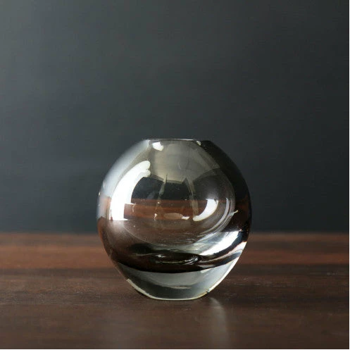This brilliant smoke grey vase crafted from molten glass. Introducing gleaming glass bud vases in rich, luscious tones of amethyst, smoke and clear. Substantial in weight, this round vase in smooth glass, captures the light and adds a glittering decorative sparkle wherever it is placed.