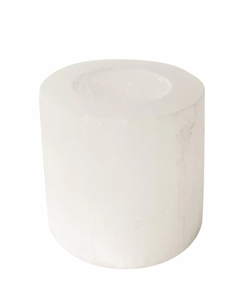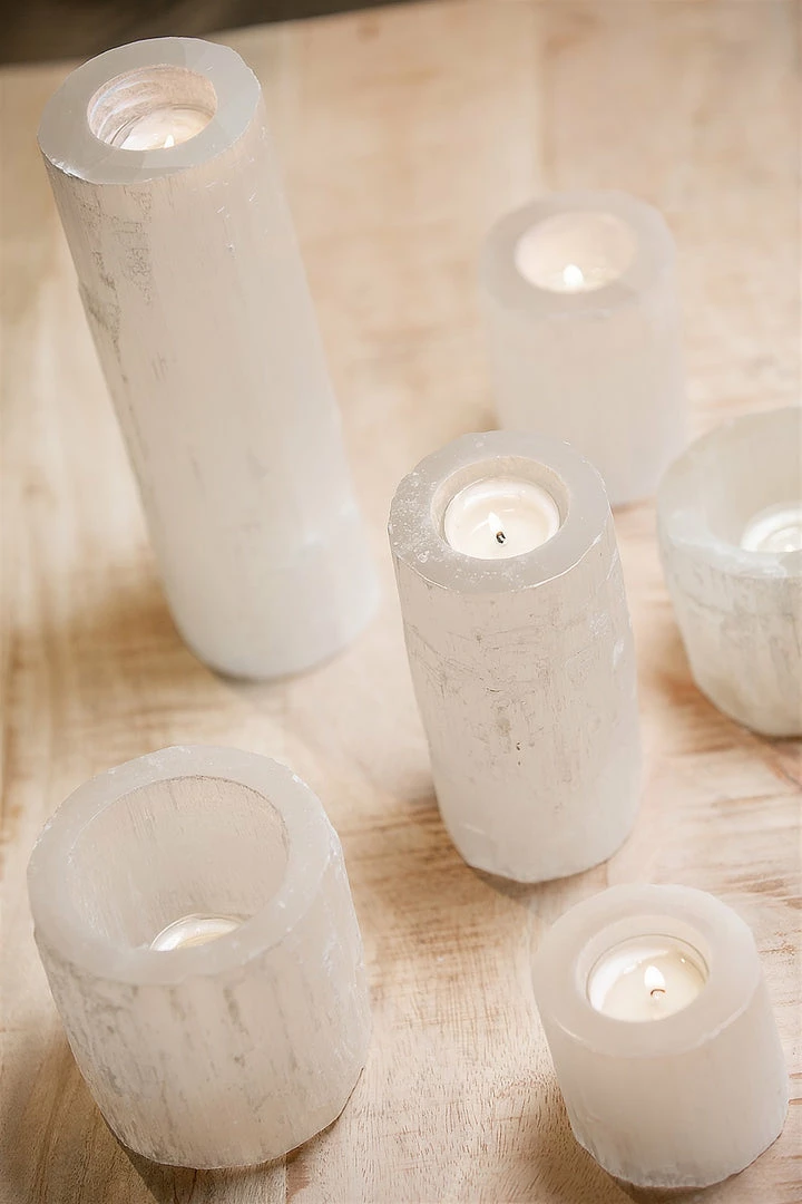 Add atmosphere to the home with this exquisite selenite candle holder. It is perfectly sized to accommodate classic tea lights, which illuminate the crystalline holder with a gentle glow.