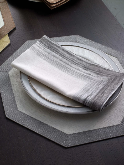 This napkin features an artistic brush-stroked metallic border and are sure to add glamour to any holiday or festive table.