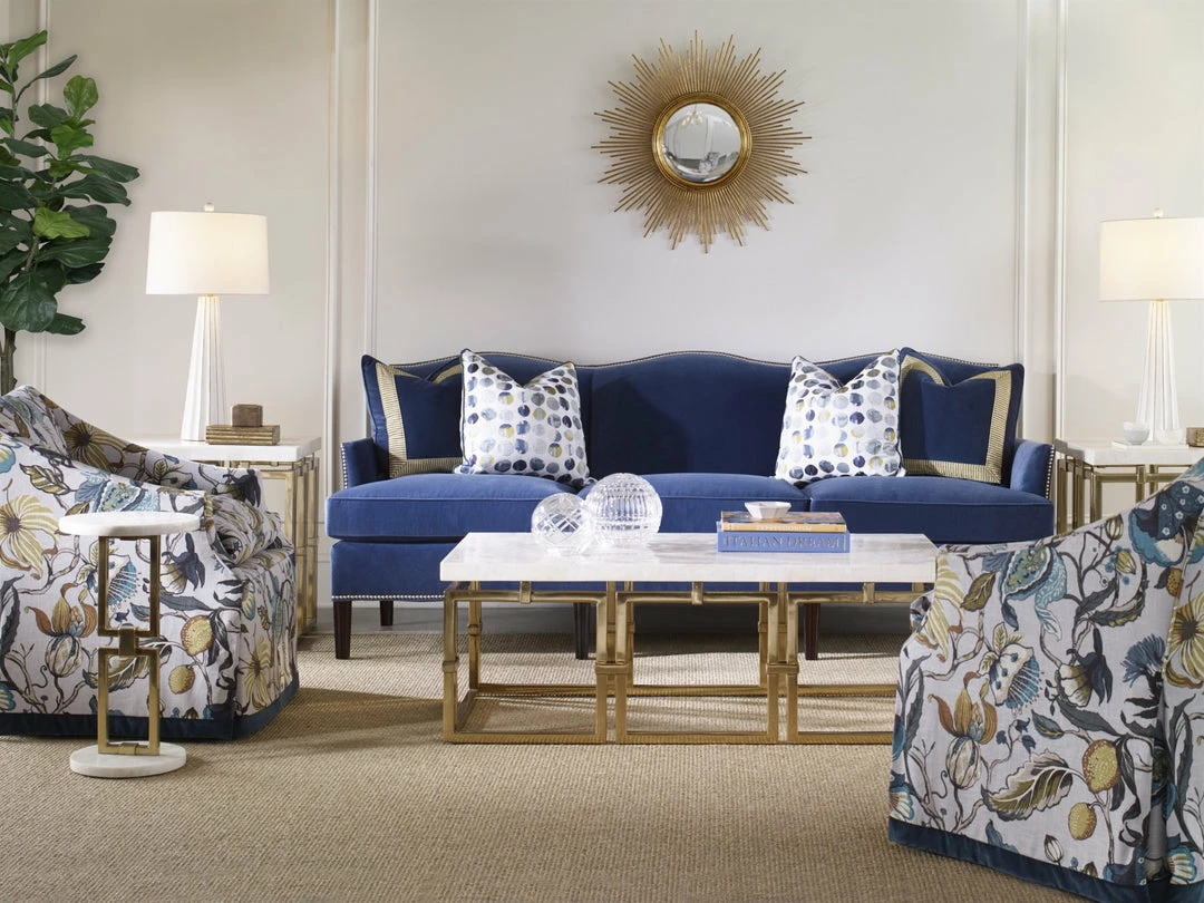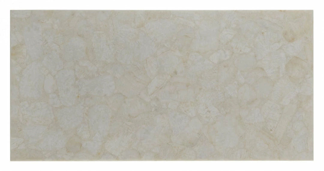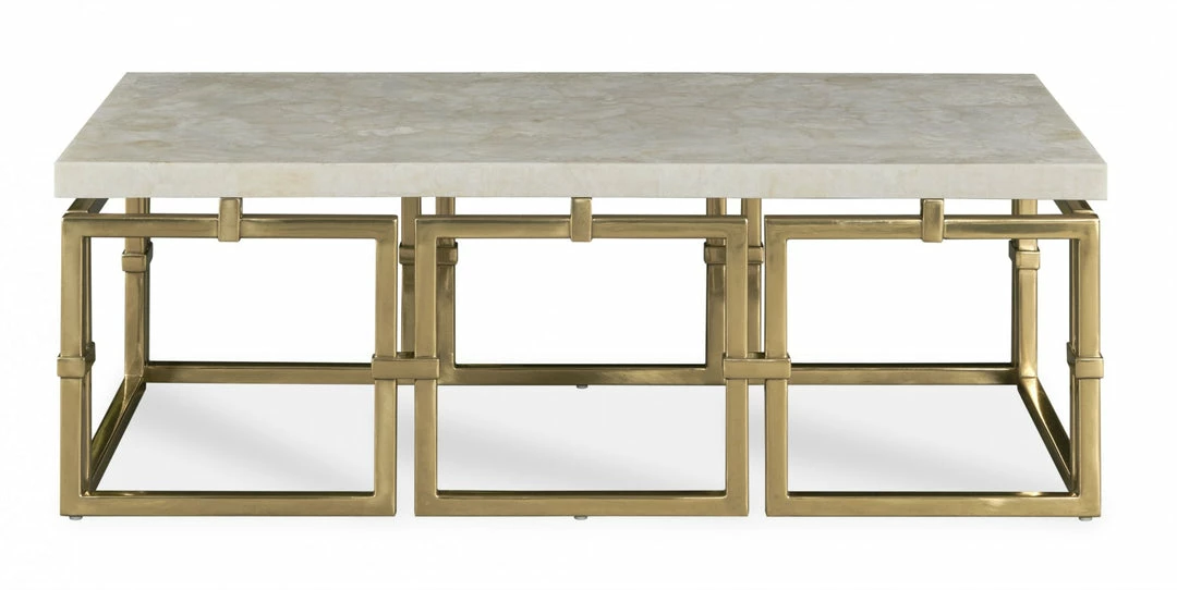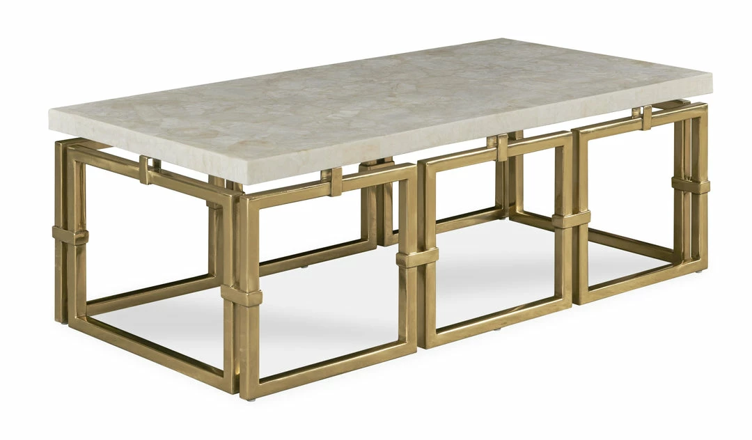 This beautiful statement cocktail table was inspired by classic jewelry links. Open cast brass fretwork base with a floating top made of crystal stone quartz in warm ivory tones. Also available as a large cocktail, side table, martini table console and desk.