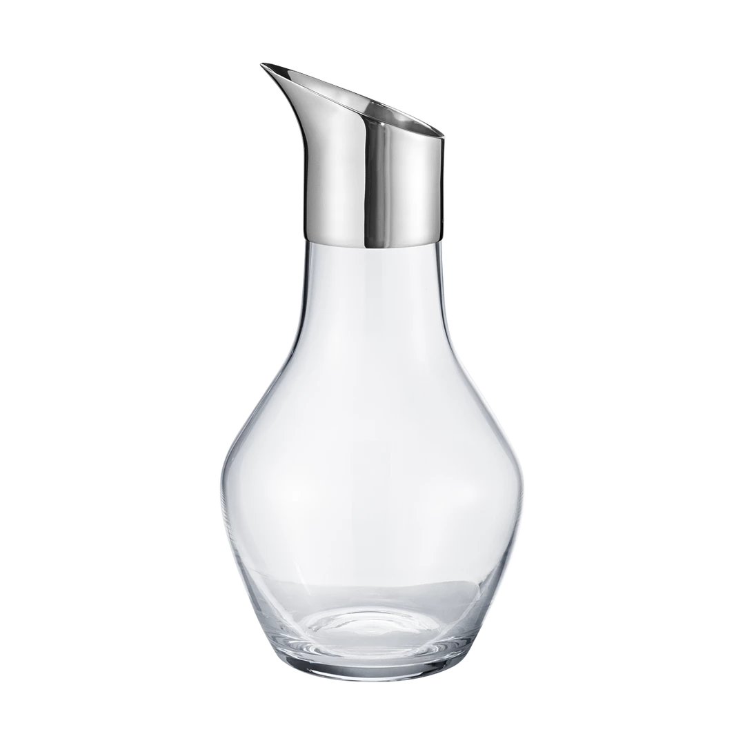 The pitcher is expertly crafted from mouth-blown glass and mirror-polished stainless steel.
