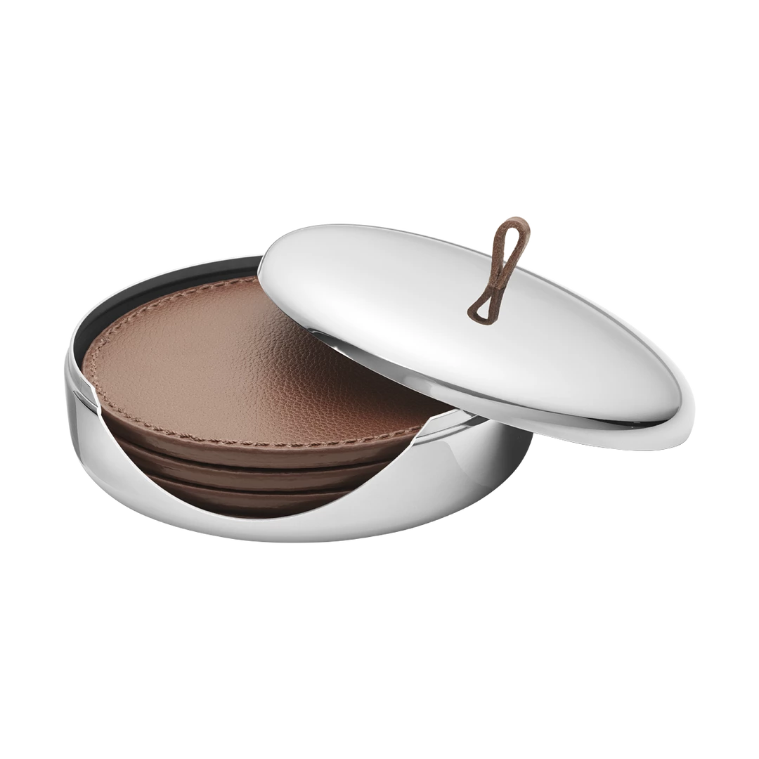 The four coasters are made from the same leather used in other Sky products. The case is made from mirror-polished stainless steel with a matching leather handle.