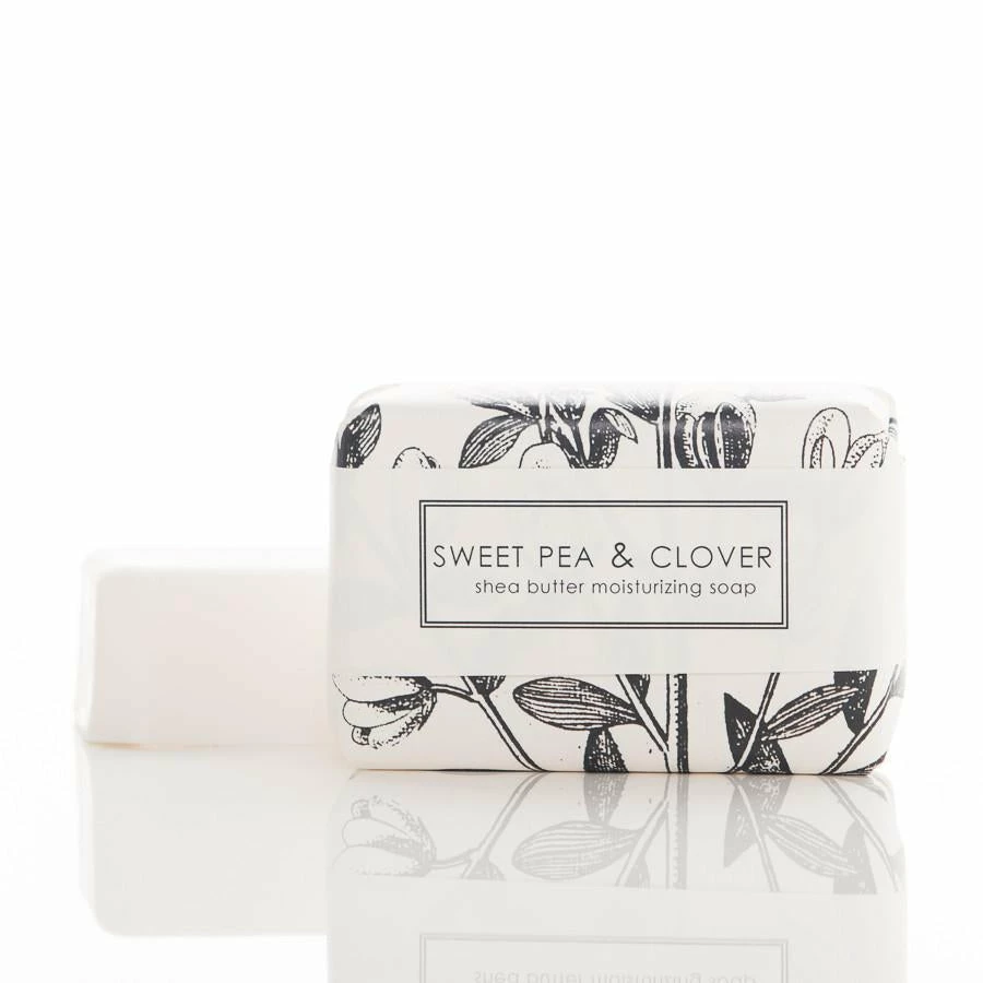 Sweet Pea & Clover shea butter bath bar packaged in a botanical and vintage illustrations.