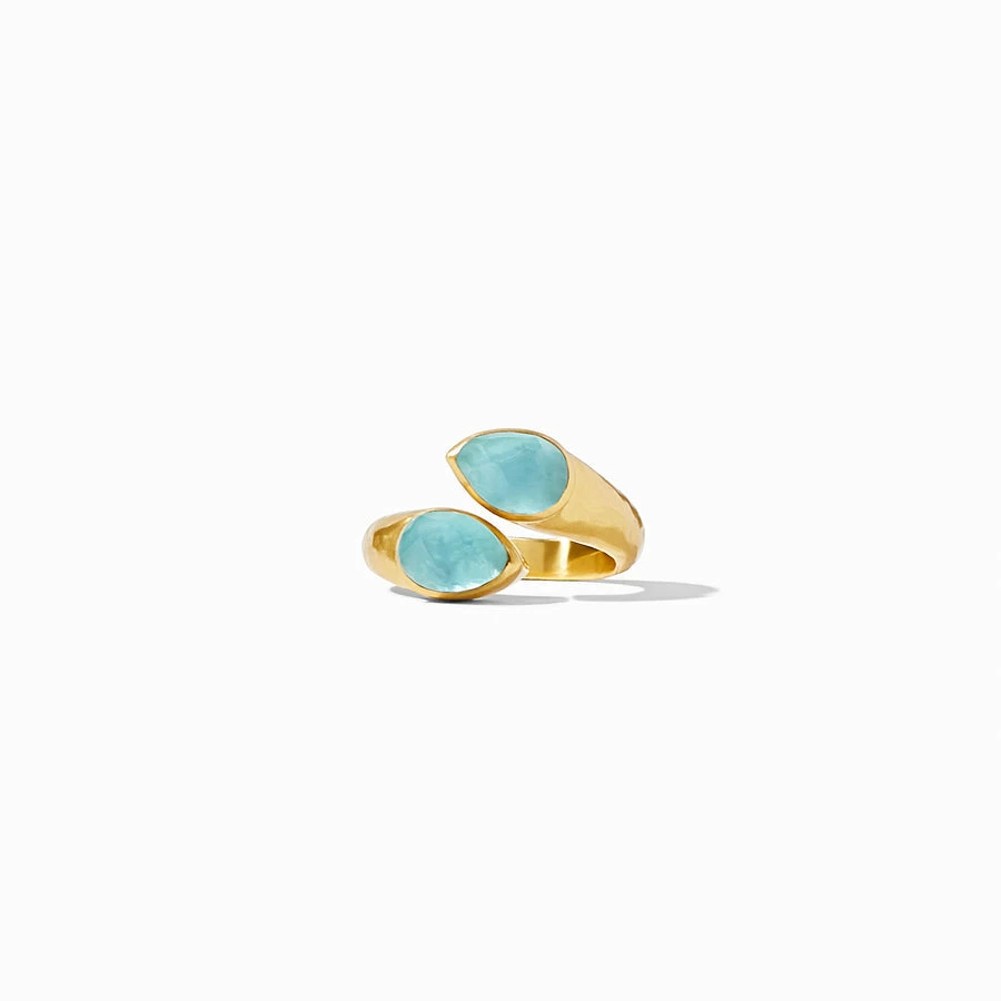 Golden wrap ring decorated with colorful endcaps of imported glass and mother of pearl.