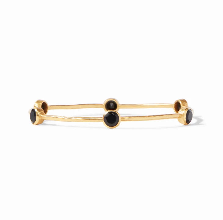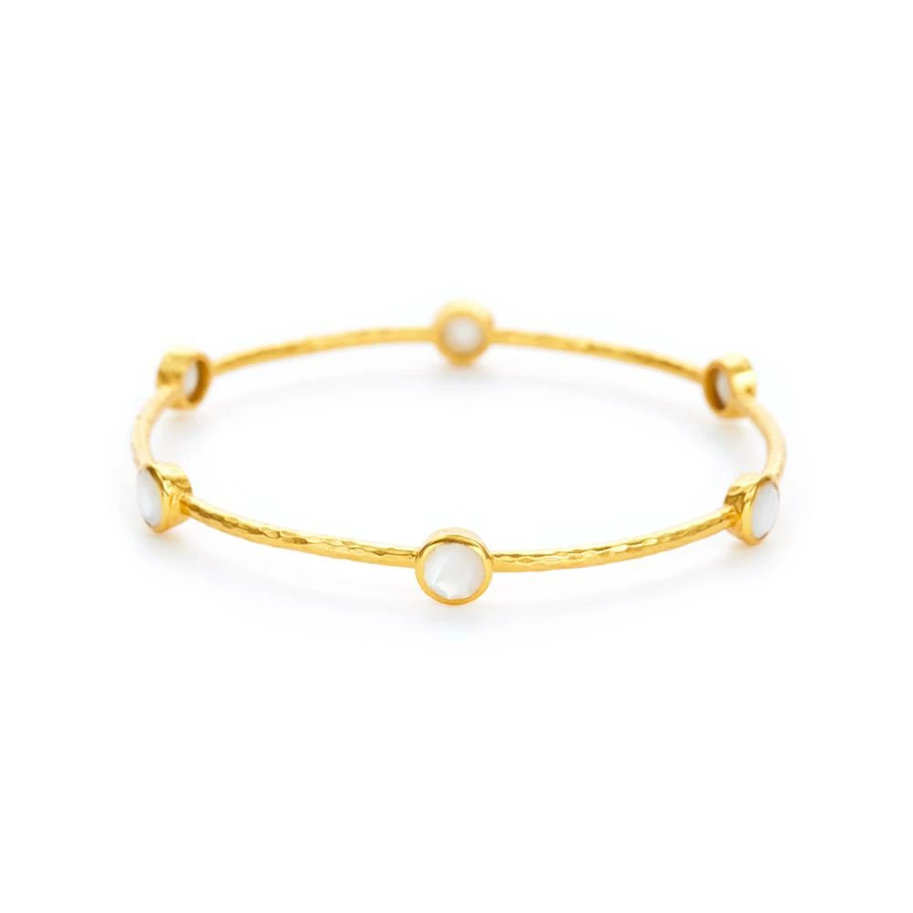 A lightly hammered bangle embellished with six sparkling gemstones.
