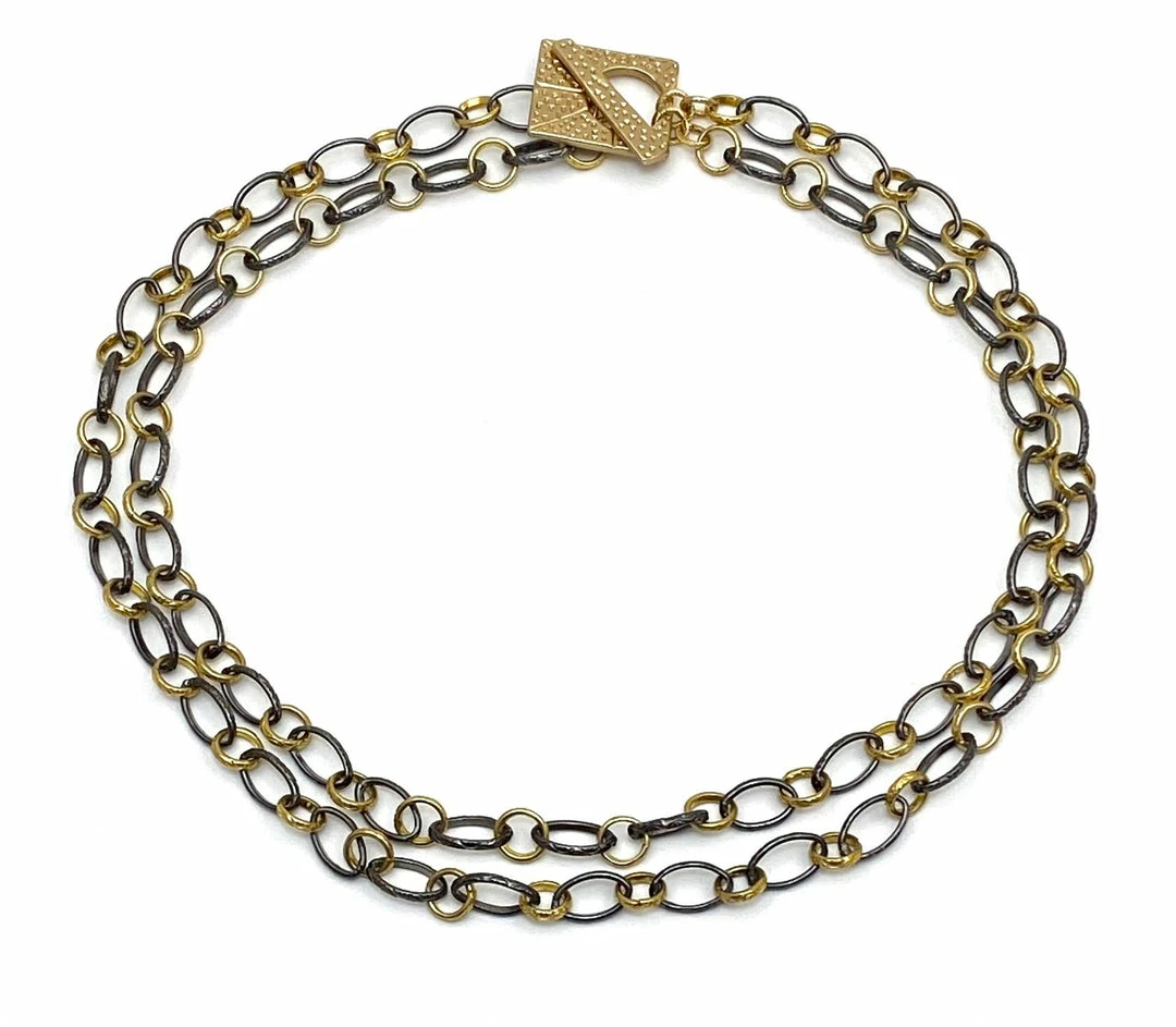 Mixed metals 14k gold plated and sterling silver black rhodium finish links with 14k gold plated double toggle. 18 1/2”