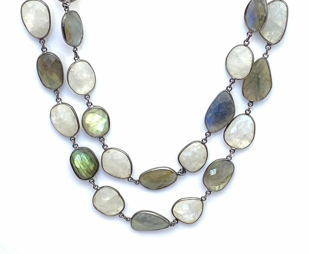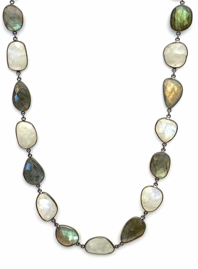 Luscious labradorite and moonstones set in sterling silver with black rhodium finish, with oxidized metal large lobster clasp. 34 1/2”