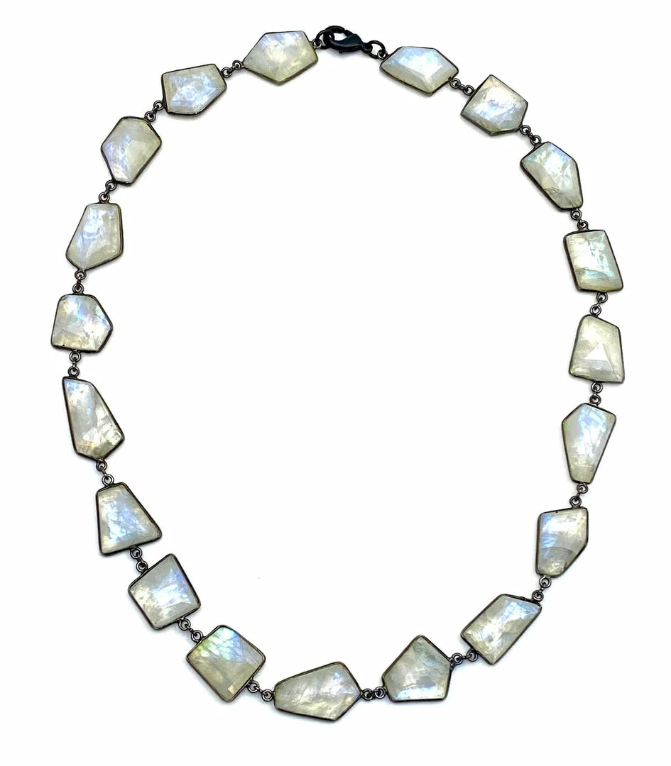 Large moonstones irregular shaped moonstones set in sterling silver with black rhodium finish, oxidized metal lobster clasp. 21”