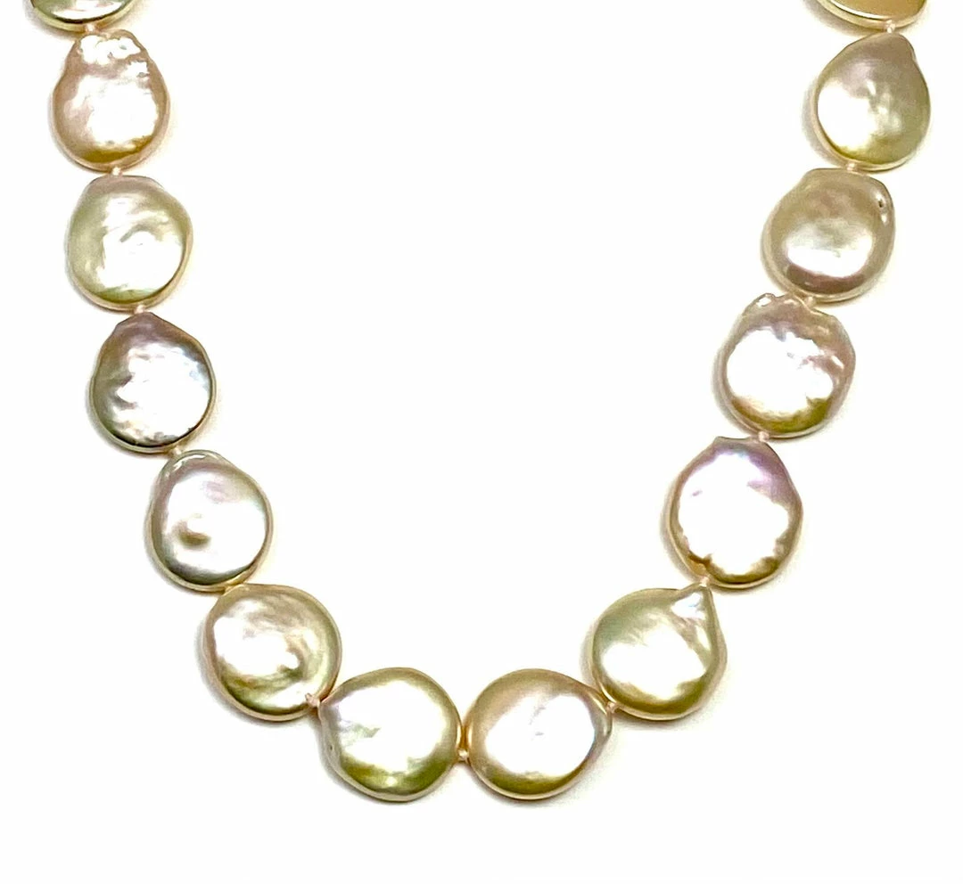 Opulent peach colored coin fresh water pearls with silk knots. Brushed 14k gold plated toggle. 18”