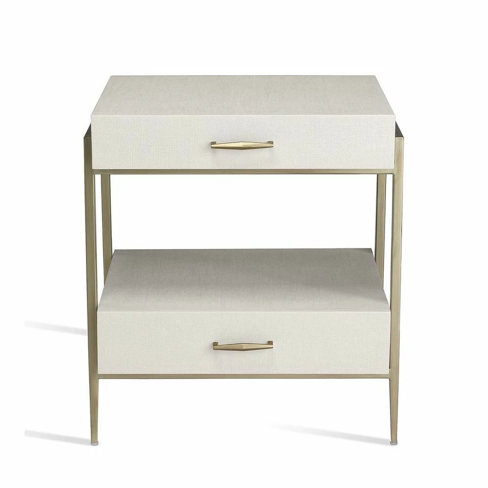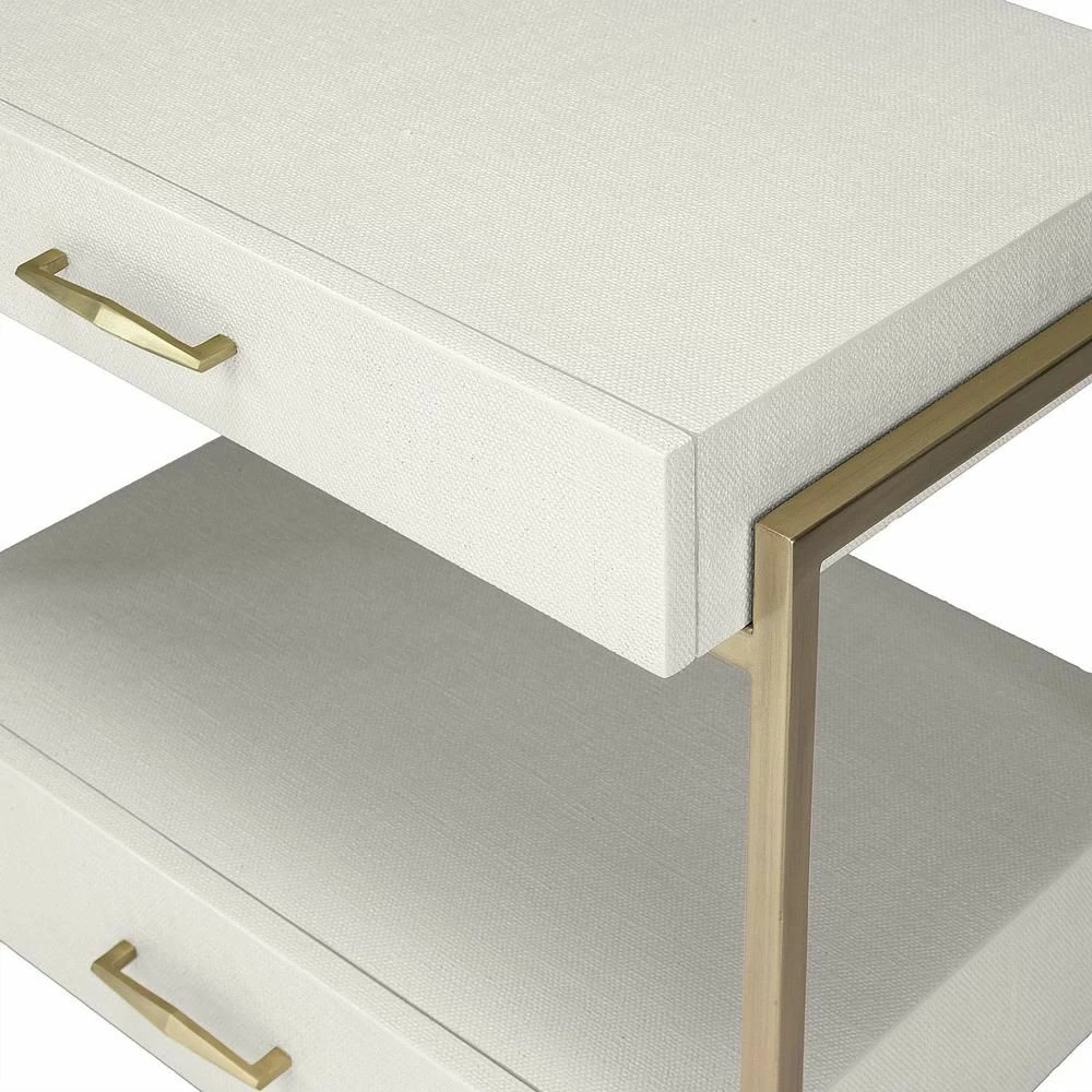 At once handsome and graceful, the Allegra Bedside Chest features a natural white faux linen surface and a metal frame in an champagne silver finish.