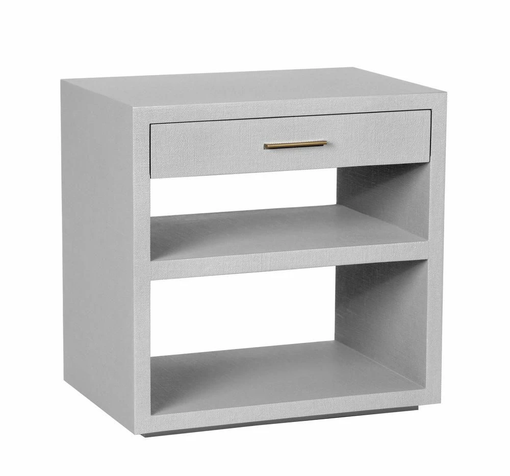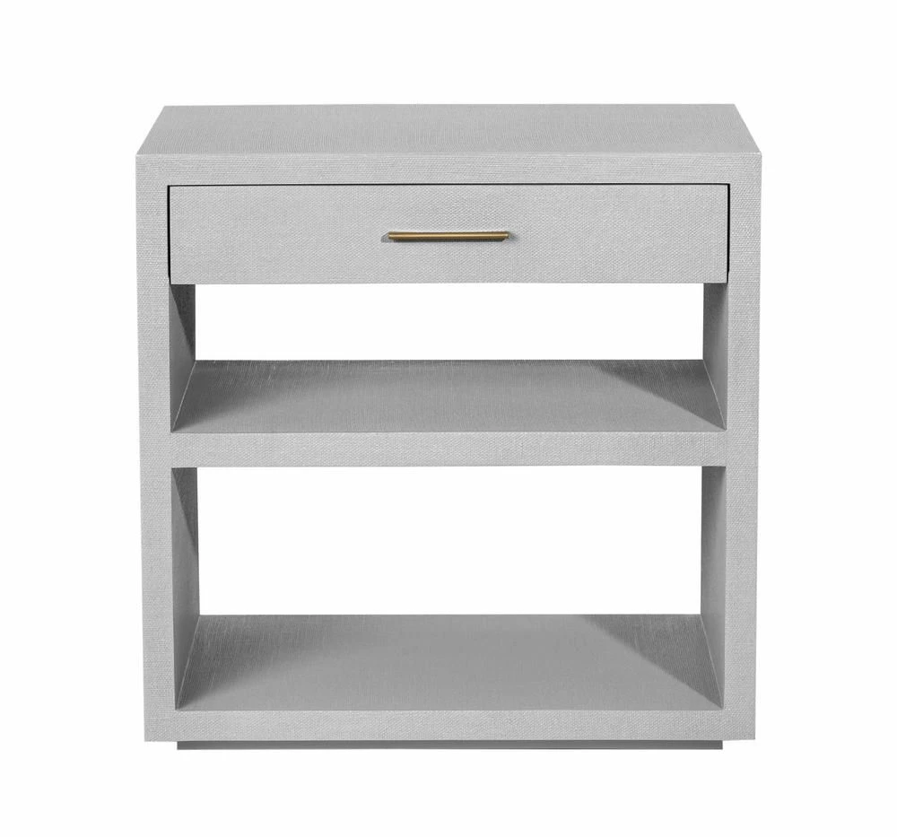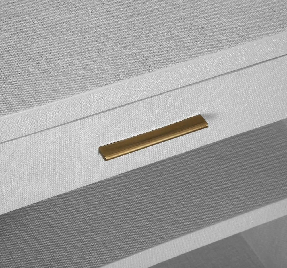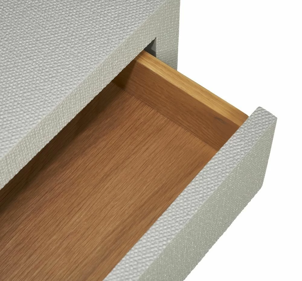 A practical bedside chest manages to retain its chic style when it’s created from light grey hand cast faux linen and antique brass-finished metal.