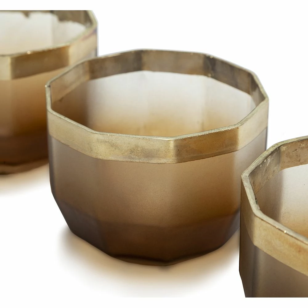 A modern decagon silhouette brings a classical feel to this trio of eclipse and champagne silver-tinted glass votives.