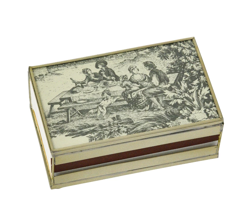 So stilish and strict. Matchboxes never looked so good when they’re held in this elegant metal and glass cover decorated with a black toile motif.