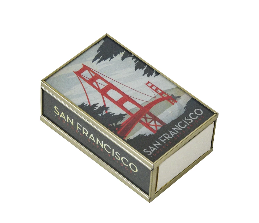 So modern and original. Matchboxes never looked so good when they’re held in this elegant metal and glass cover decorated with a San Francisco picture.