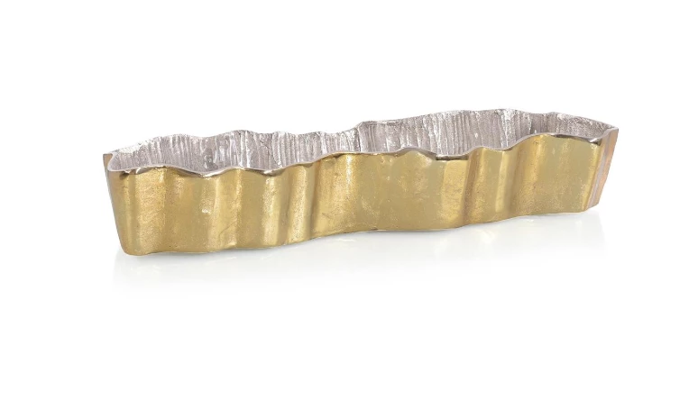 With a flat bottom and fluid ribbon sides, this accent bowl is beautifully versatile. The neutral tones of champagne gold on the outer sides and silver with clear enamel on the inside make this piece perfect for all decor.