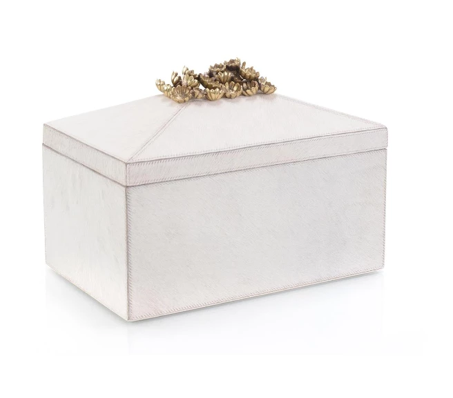 A beautiful white hair on hide box is embellished with a hand-cast brass cluster of flowers.