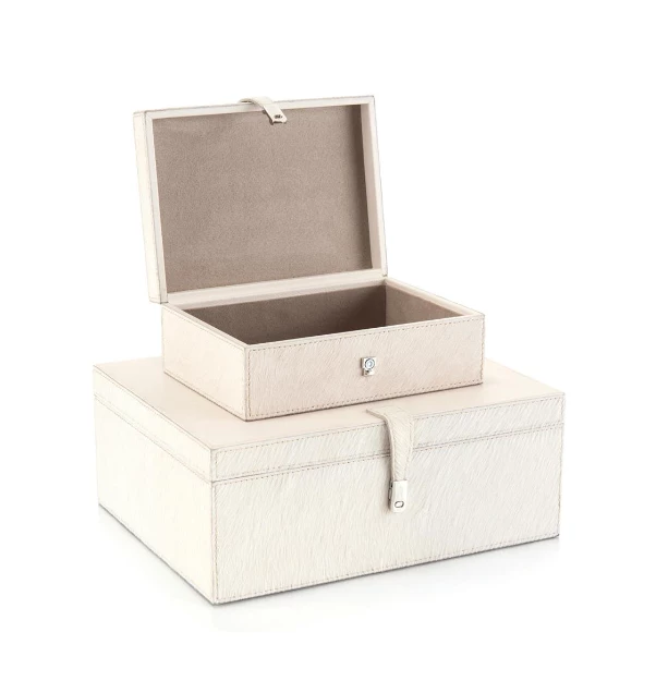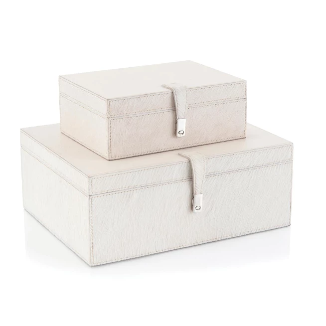 This set of two white hair on hide with cream leather boxes is the perfect hideaway to tidy your desk.