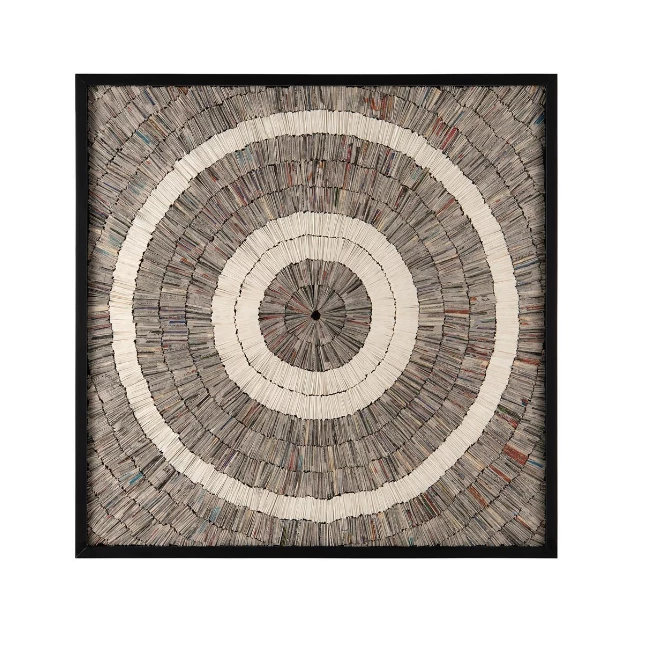 This paper art by Mark McDowell features folded, gathered, and pleated watercolor paper in tones of grey and white, creating a sculptural perspective. The art is displayed under glass and surrounded by a contemporary black frame.