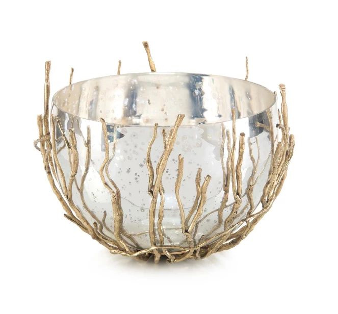 The fluidity and movement of sprouting brass saplings encase a silvered bowl. The reflection of each branch adds depth to this wonderful piece.