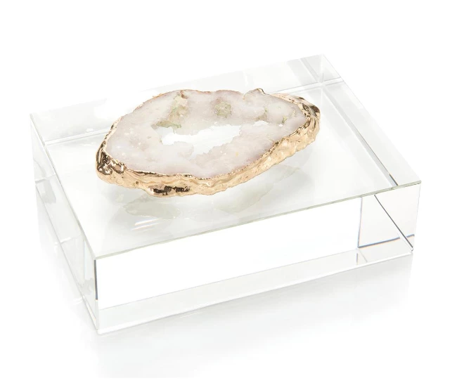 A white geode slice with gold plating is mounted on a clear, lead-free crystal block, creating an elegant and timeless accent. Disclaimer: Variations in size, shape, and color are normal with natural stones.
