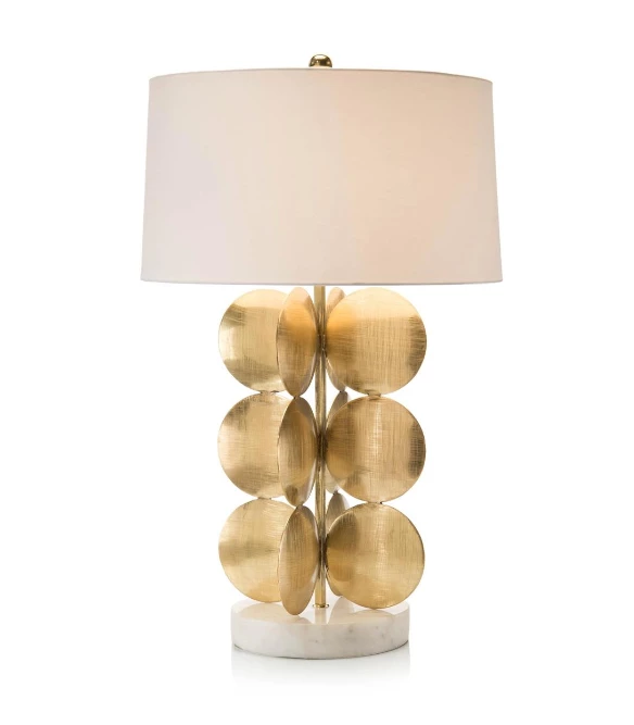 This lamp has handmade brass circles with a unique scratched etched finish that sit atop a creamy marble base.