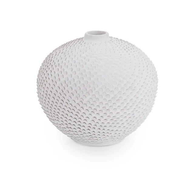 Embellished with an intricate, handcarved pattern by artisans, the rounded shape of this vase accentuates the uniqueness of the dramatic detail in the design. Handcrafted, this porcelain vase is finished with a matte white glaze fired in high temperature.