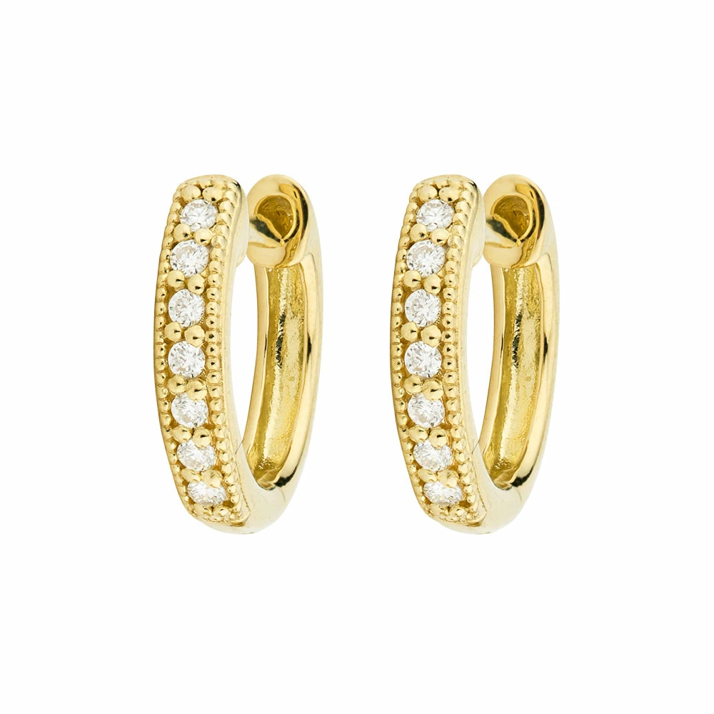 The Small Diamond Huggie Hoop Earrings feature sparkling round diamonds pave set in 18K gold..