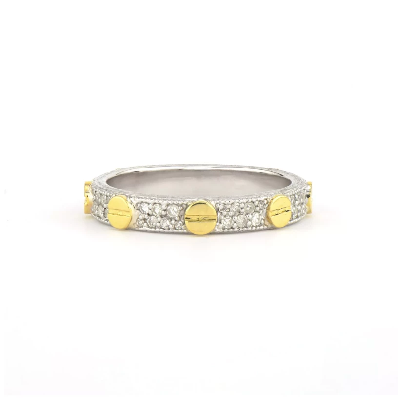 From the Mixed Metal Collection, the Mixed Metal Diamond Pave Nail Head Band features pave round diamonds set in sterling silver accented with 18K yellow gold nail heads with a high polish finish.