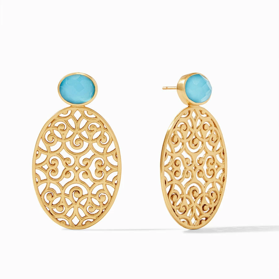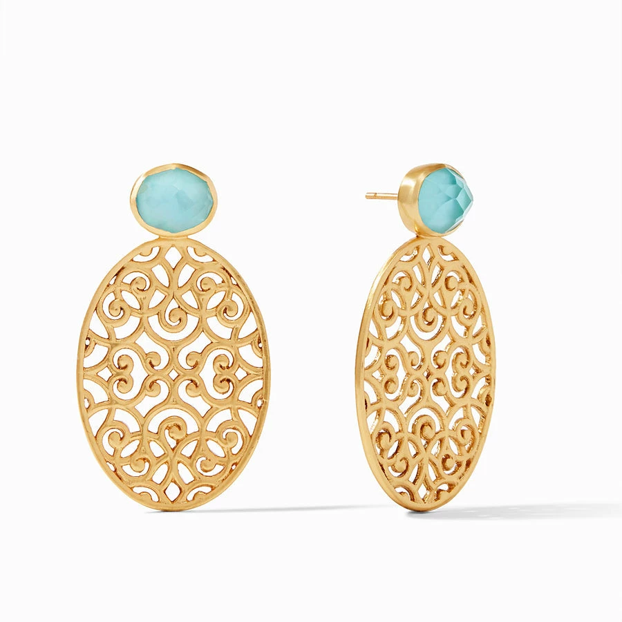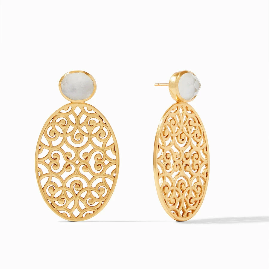 An ornate oval-shaped statement earring with a gilded lacy openwork is suspended from a sparkling, round rose-cut gemstone of imported glass.
