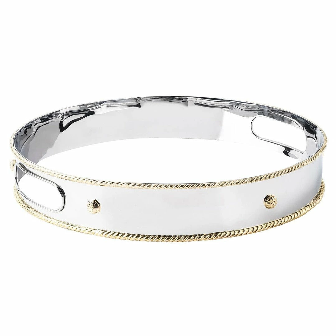 Sculpturally accented with our iconic berries and threads in lustrous brass, our Periton collection is handmade in stainless steel and polished to brilliance. This round tray features two handles and vertical sides, making it perfect for serving cocktails or corralling decorative objects.