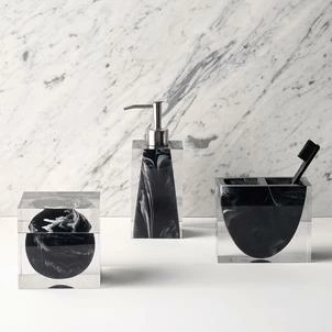 Adorn your spa with these bath accessories. Crafted with ink-injected resin that floats seamlessly in a translucent acrylic encasing, these accessories complete a bathroom that radiates with textural and modern appeal.