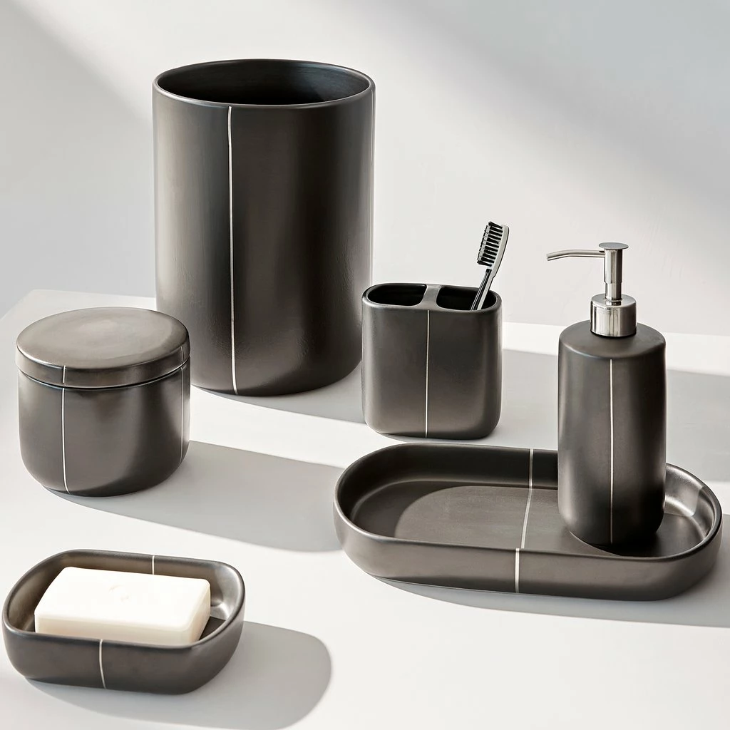 Crafted from stoneware and detailed with a hand painted line, Nero Bath Accessories are the perfect addition to any modern bath.