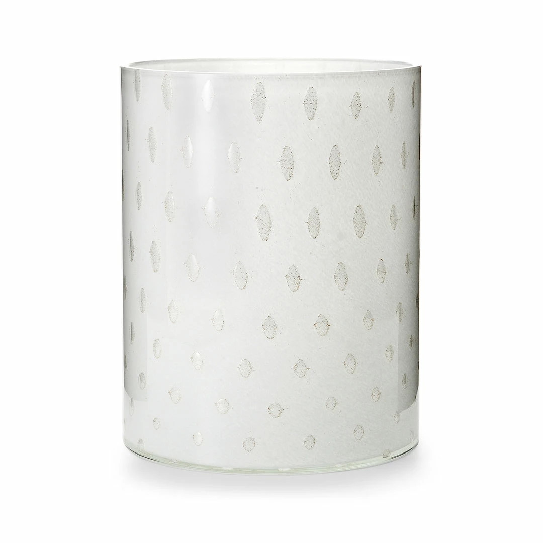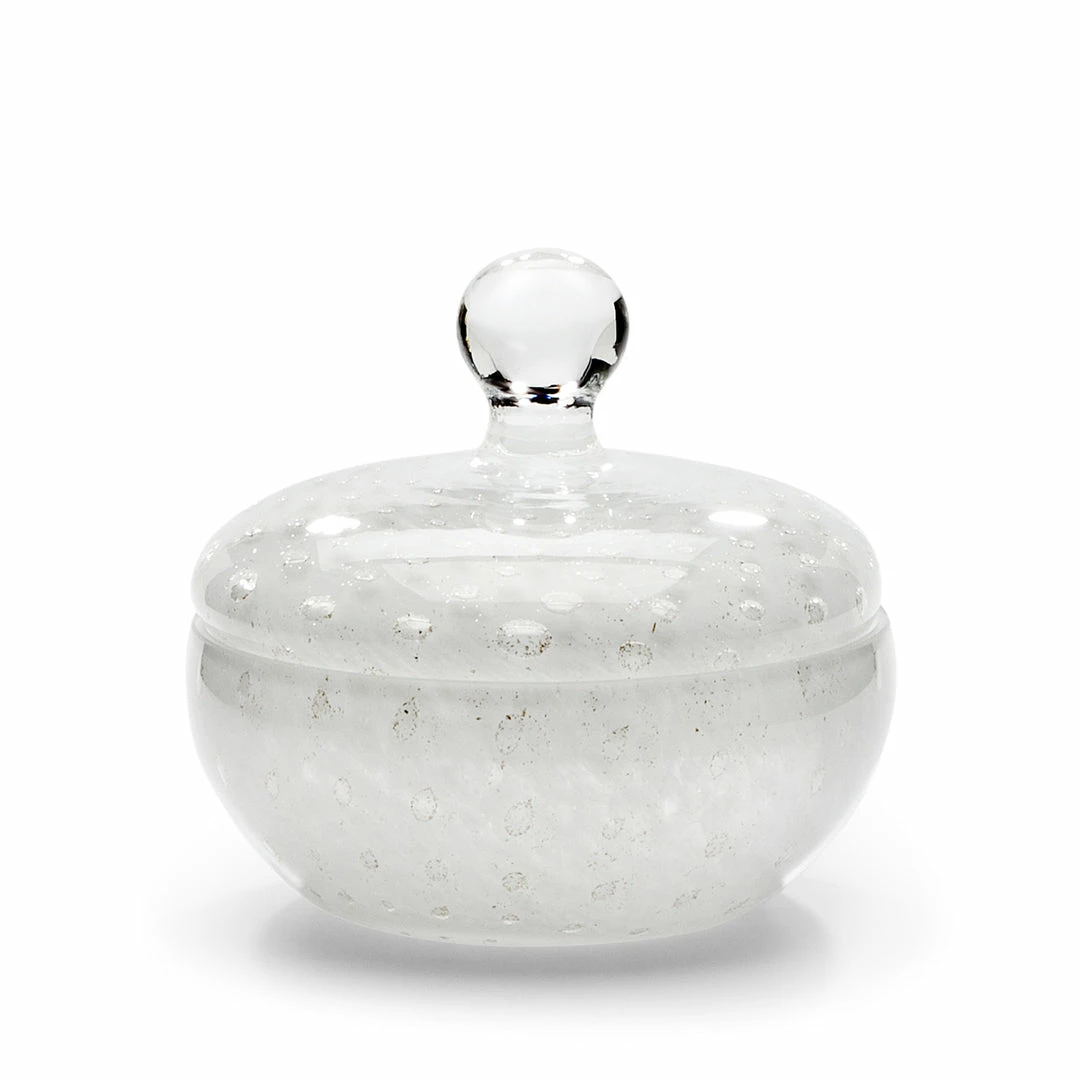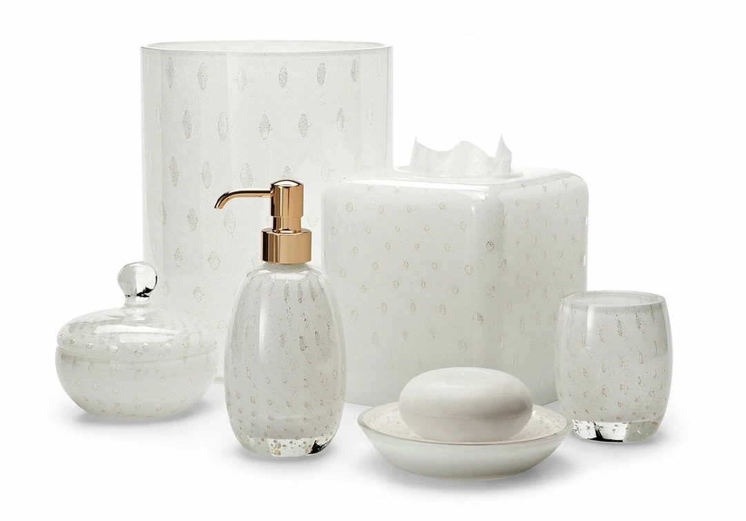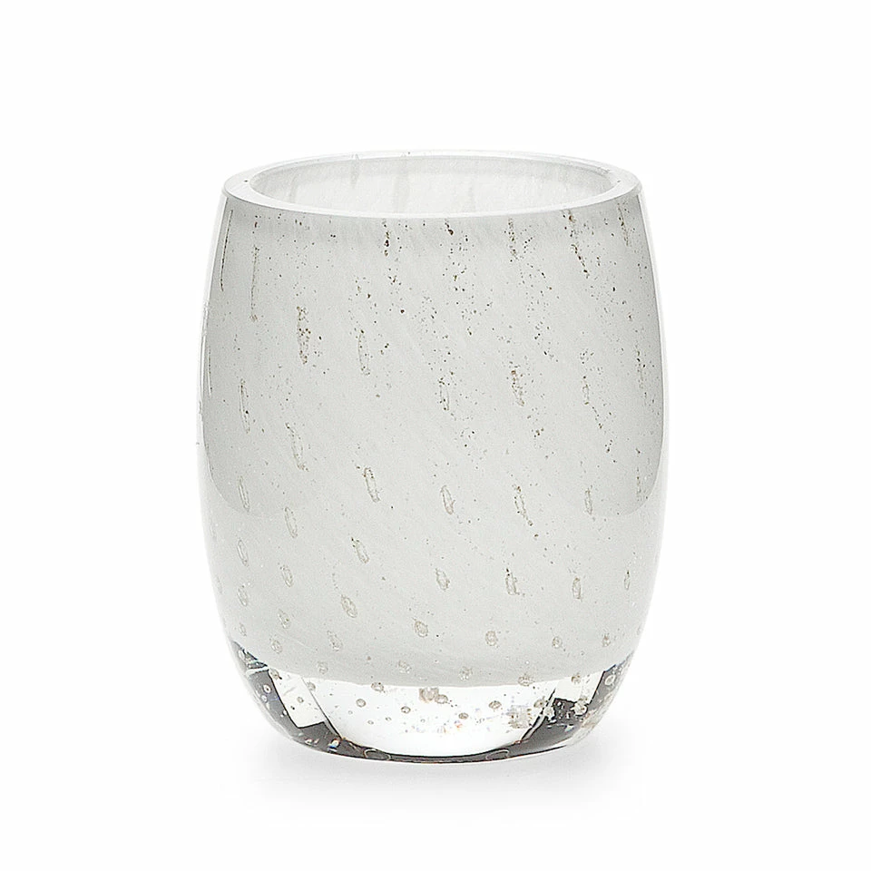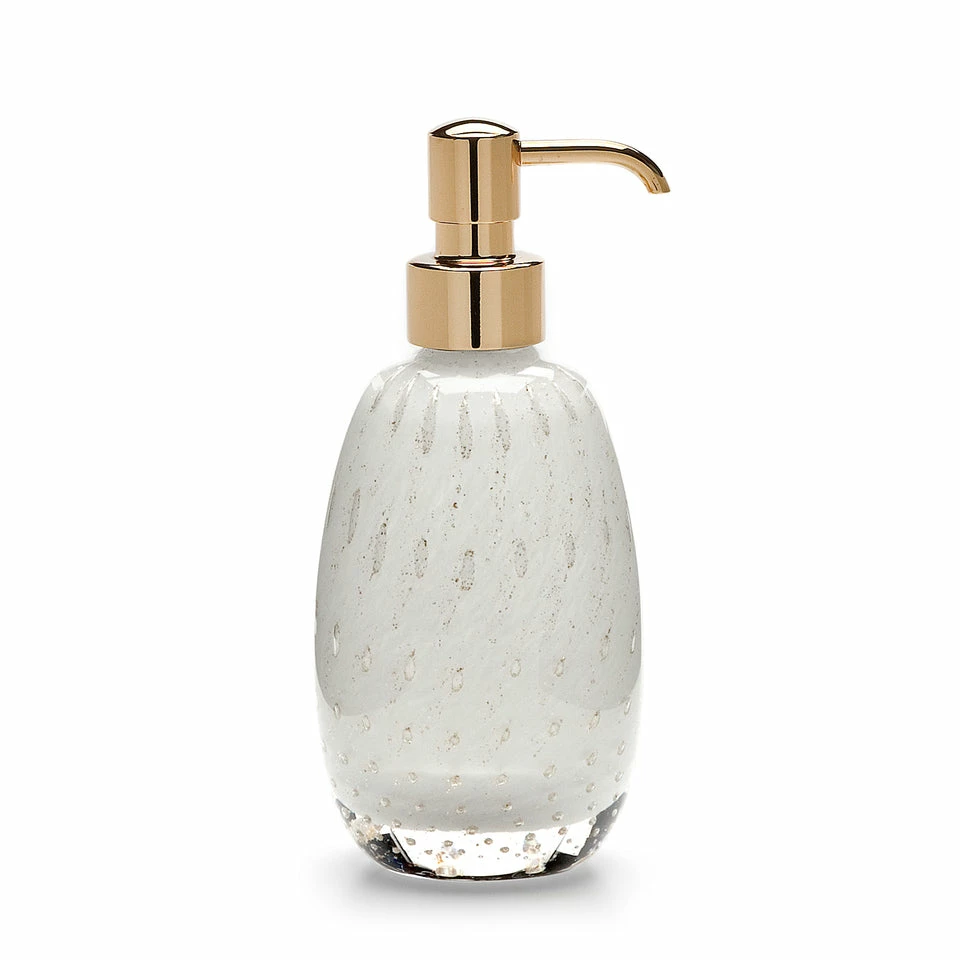 Sparkling fragments of gold and silver leaf are layered on milky-white, mouth-blown glass. The leaf is applied to the molten glass in tiny dabs that expand when each piece is blown. Made In Italy.