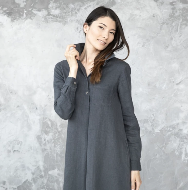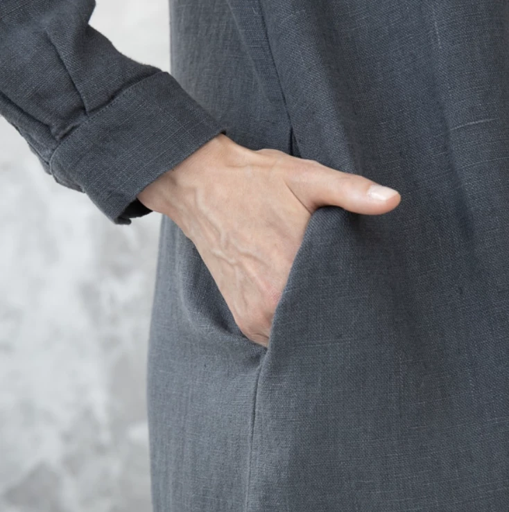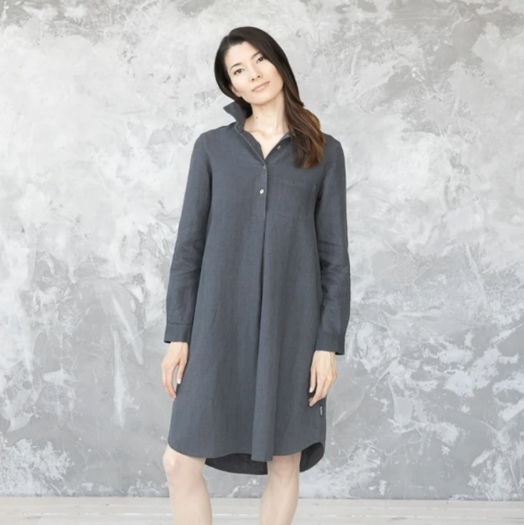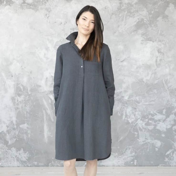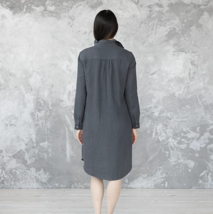 With a fluid, drapey silhouette and long sleeves, our Charcoal Linen Dress Camilla dress is versatile, comfortable and effortlessly stylish. Thanks to the understated gathered detailing to the cuffs and back, delicate buttons and two handy pockets, this linen dress works as beautifully on a summer picnic as in the office.