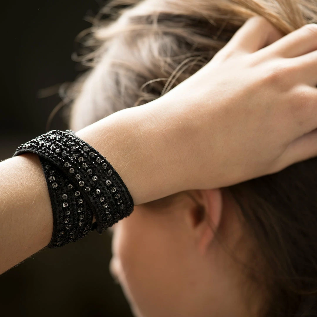 This bracelet fit for a goddess wraps twice around the wrist and is closed by a magnet. With a black suede base, light is refracted by the beads and tiny sequins tightly sewn in rows, relating to the harvest deity it is named after.